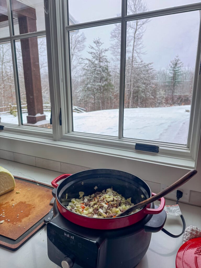 This one arrived gently (and on a Saturday, no less), with snow falling steadily all morning—thick, quiet flakes that softened everything they touched. The timing couldn’t have been better. As we sipped coffee and cooked breakfast, the snowfall really picked up. Watching the girls wander into the kitchen with messy bedhead was such a sweet moment—K bursting with pure, childlike excitement, and H delivering a deeply happy but still sleepy teenage, “It’s snowing!” announcement.