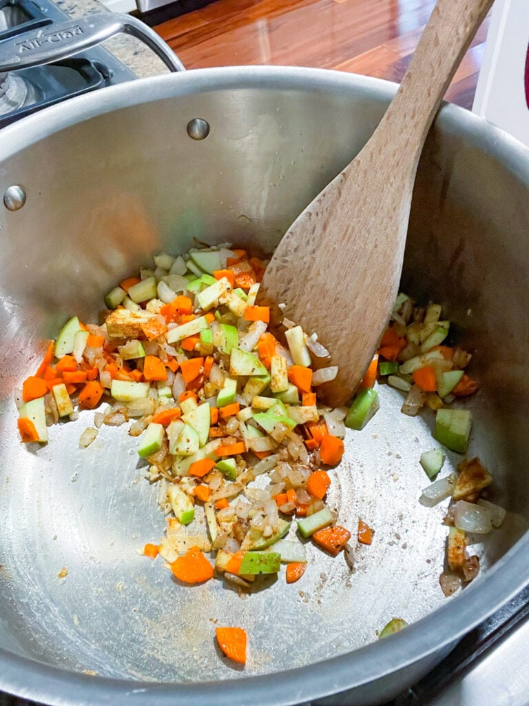 While the squash cooks, heat a medium saucepan over medium heat. Add 1 Tbsp olive oil and the onion. Sauté for 3-4 minutes. Add the garlic and ginger. Continue cooking over medium heat for 1-2 minutes.
