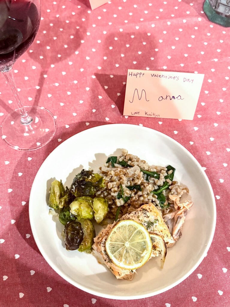 - Valentine’s dinner: Lemon dill salmon, roasted Brussels sprouts, and a shallot and spinach farro I totally winged — finished with lemon and parmesan and it turned out so good.