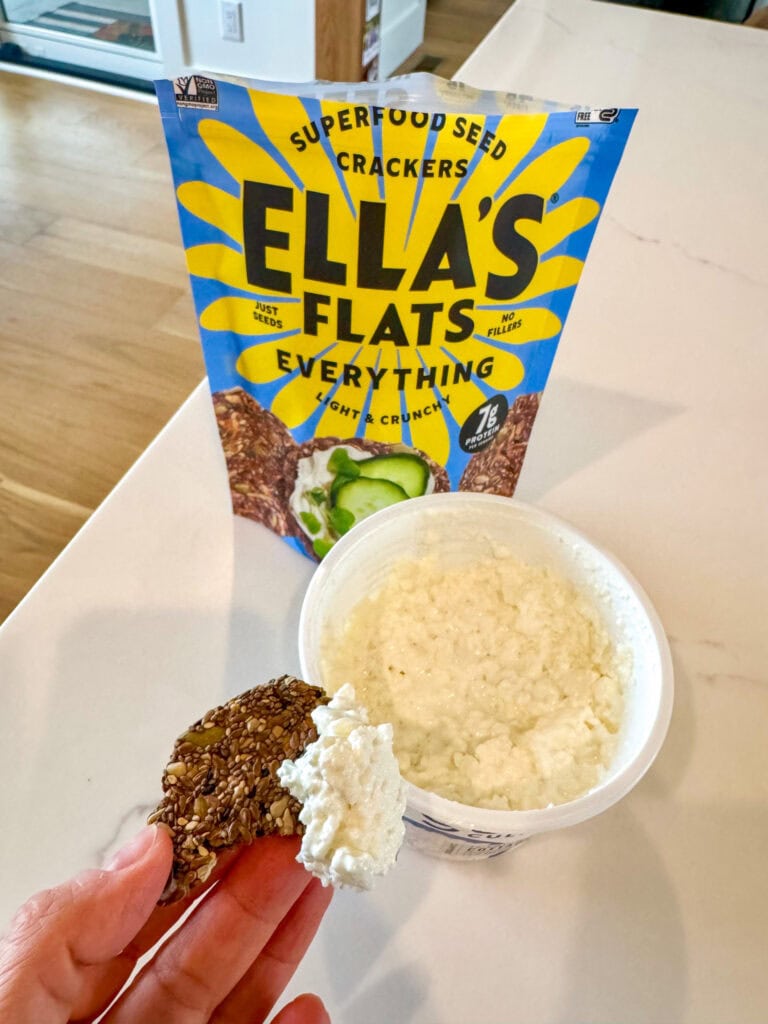 I also discovered Ella’s Flats — a seed cracker with 4g of fiber and 7g of protein per 3 crackers. I love them for scooping cottage cheese or any dip. They aren’t quite as hard as Mary’s Gone Crackers, which I appreciate.
