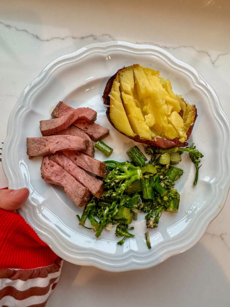 - Sirloin tip roast (low and slow), sweet potatoes, and baby broccoli.