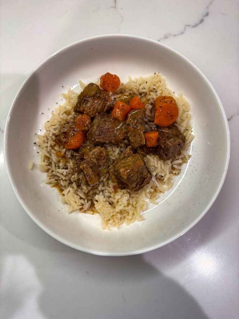 - Slow cooker beef stew, minus the potatoes and served over rice. This is mine and Hailey’s favorite comfort winter meal right now.