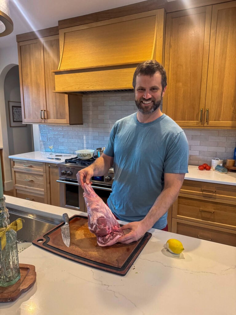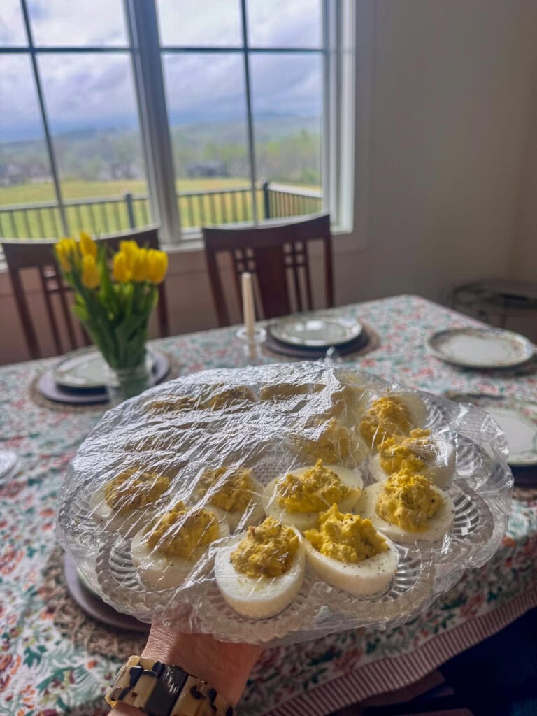 David took on the lamb leg and knocked it out of the park using butter, garlic, fresh rosemary, fresh thyme, salt, pepper, and a splash of white wine. I plated the deviled eggs and delighted in yet another use of shower caps in the kitchen. Hailey set the table.