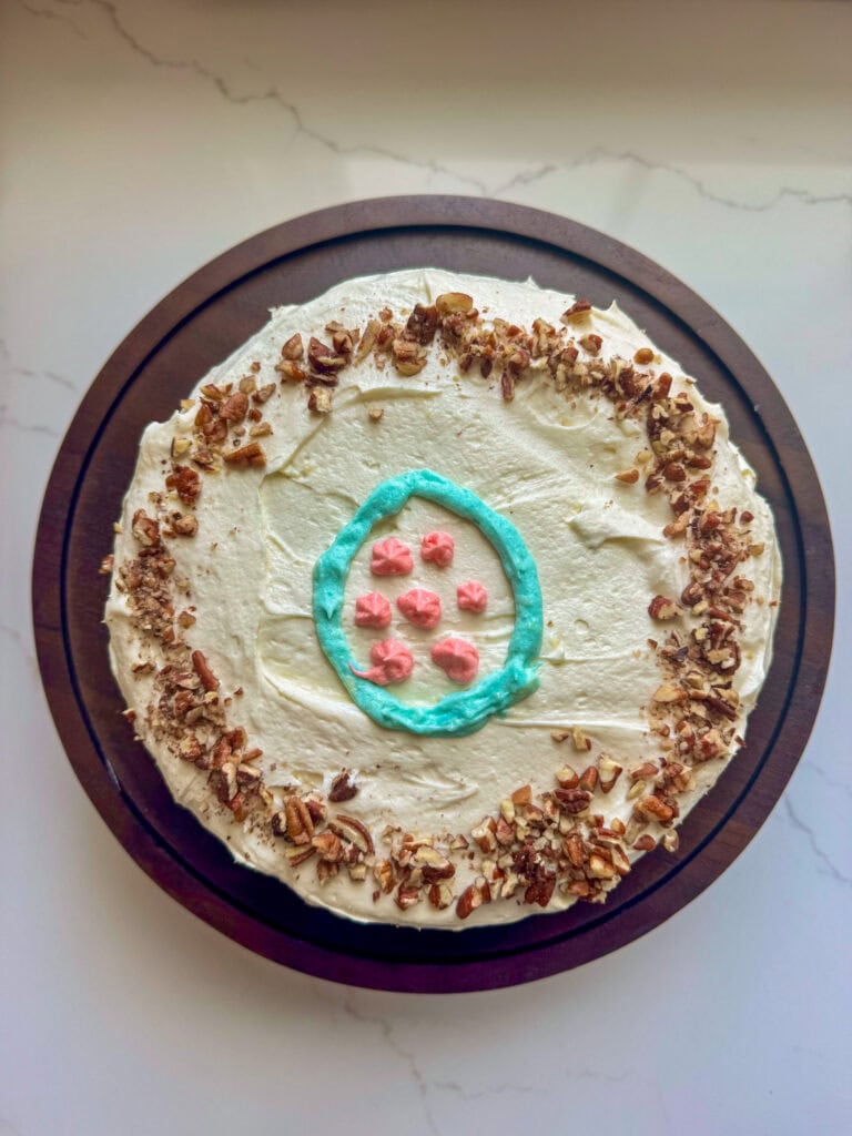 K (my baker) and I took on baking a carrot cake. We used Sally’s recipe for both the cake and the cream cheese icing and boyyyy was it good. K asked to decorate it, so how could I deny her? Her simple little Easter egg was the perfect finishing touch.
