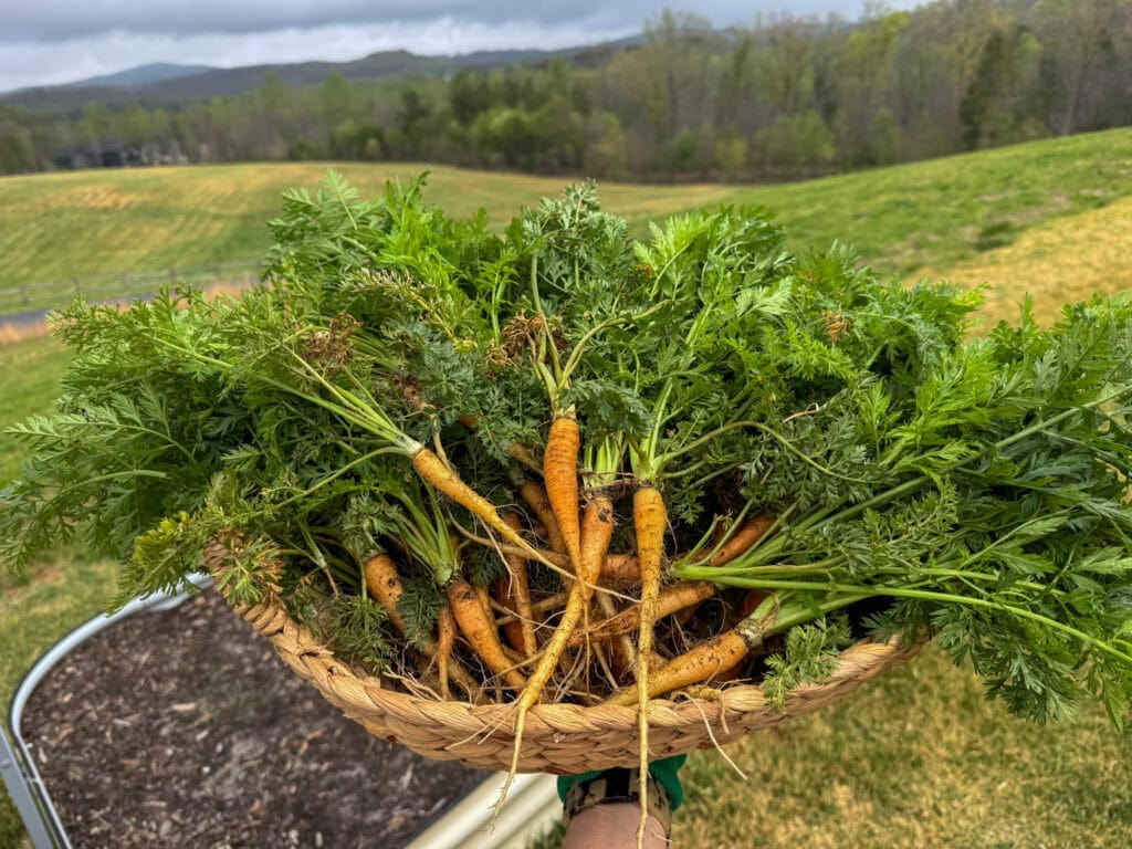 The fun really began on Saturday with carrots. First, I harvested all the carrots from my garden, tossing the tiny ones and any with bugs to the chickens and salvaging the others to wash and peel and serve as part of our Easter meal.