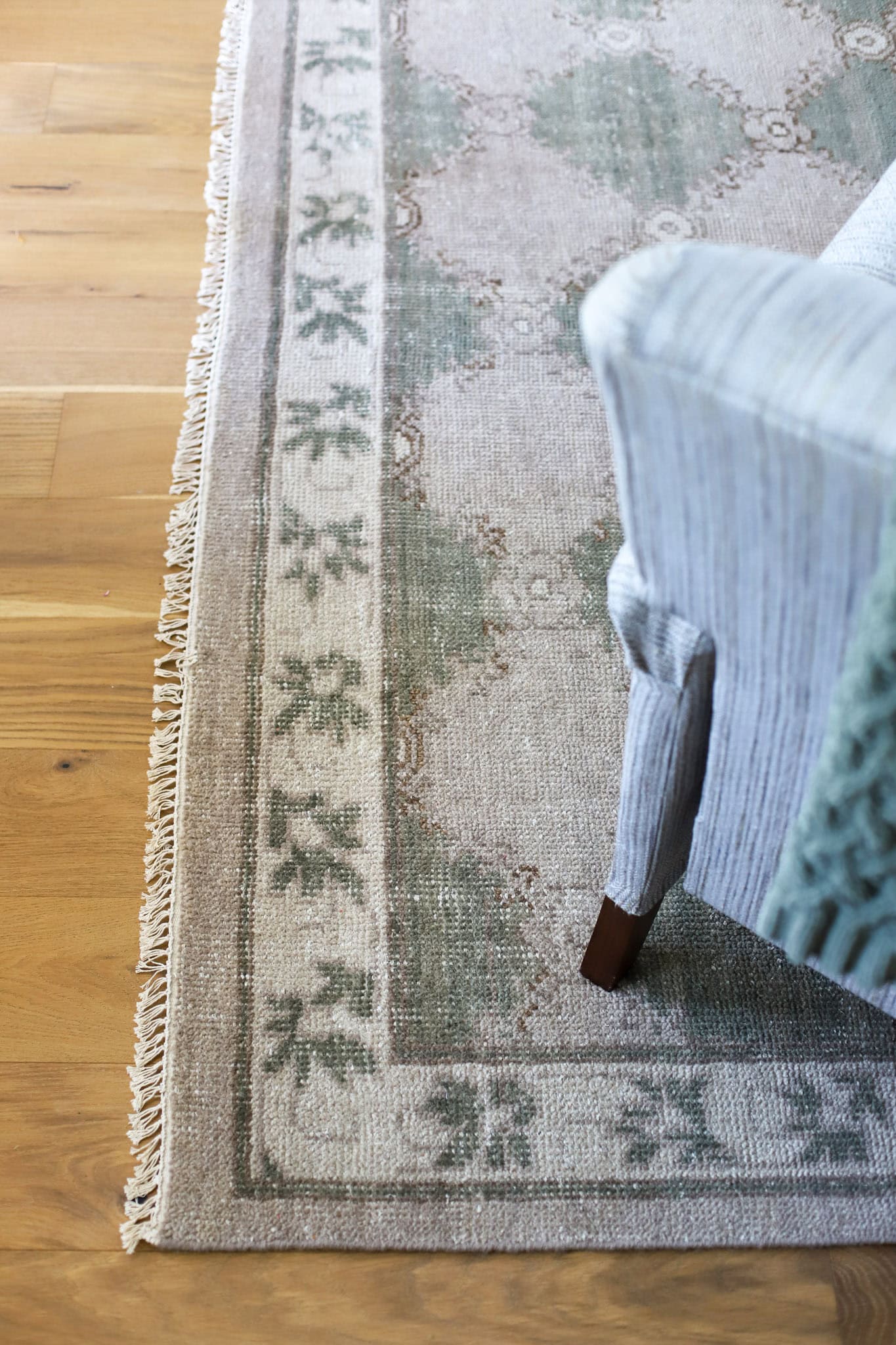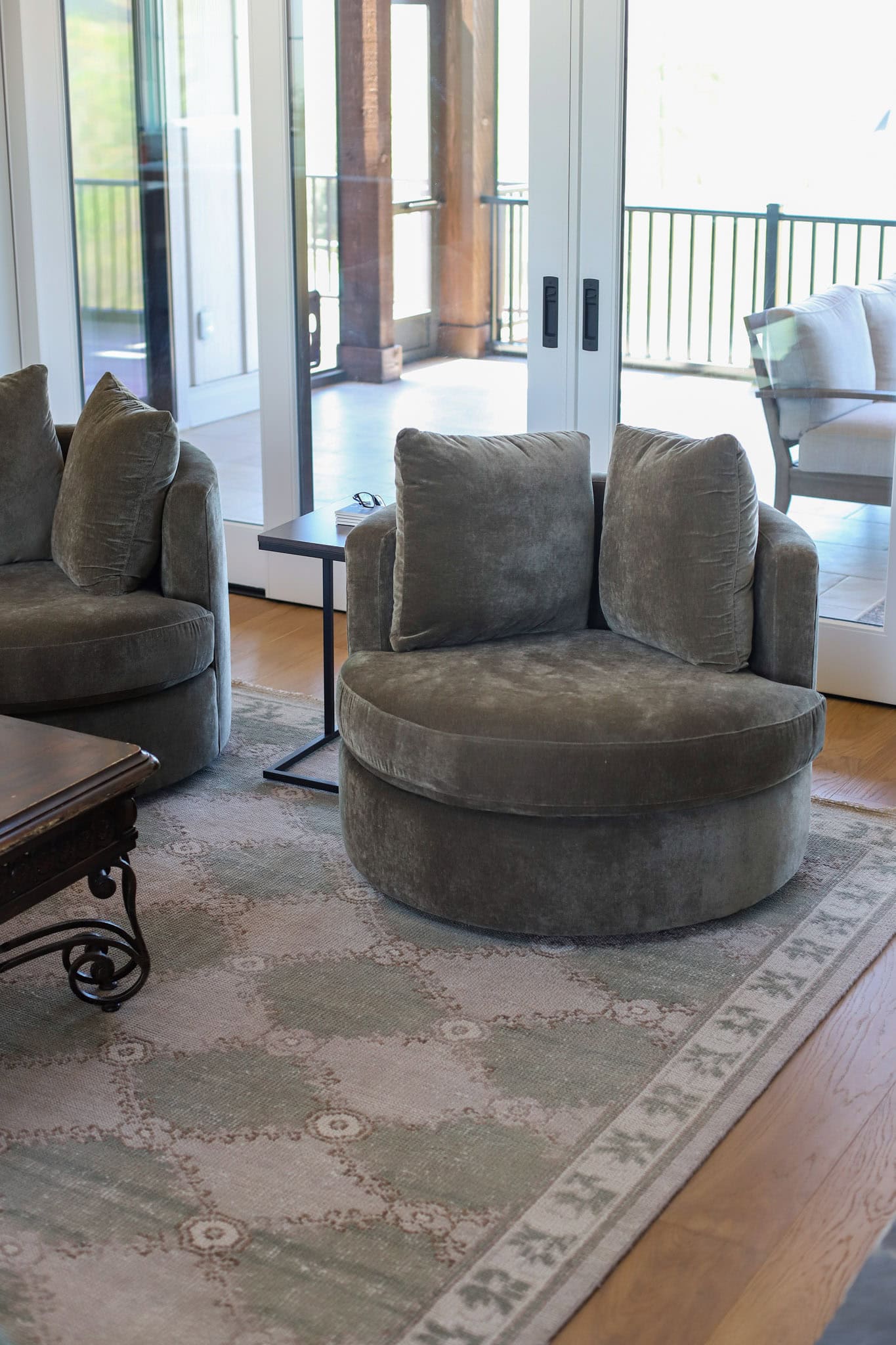 One thing I promised myself with our new home is that I would decorate it. I want it to reflect us and feel like our home. We always kept the old one so neutral, knowing we’d sell, so I’m really leaning into personalization with this one. Well, I’m trying to lean in. I’m so timid with decorating decisions, but I’m working on it. One color I’m always drawn to is green. I love a mossy, cozy green color and almost went that route with my kitchen cabinets but balked last minute (and am kind of glad I did; I really like the neutrality of my quartersawn white oak). My main focus right now is to create a cozy living room by fall and the first piece of my puzzle just arrived- my new rug (I got the 10’x14′) and my new swivel chairs (40″ in moss performance suede) anddddd I LOVE both so much.