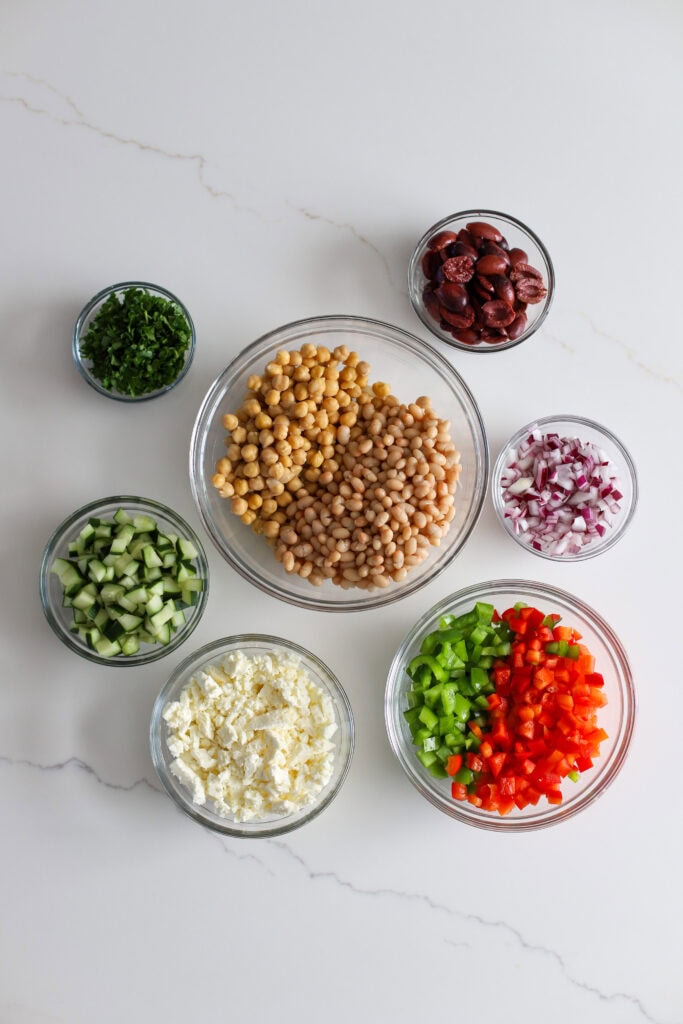 In a large bowl, add the chickpeas, navy beans, onion, bell peppers, cucumber, olives, feta, and parsley. - Whisk the dressing.