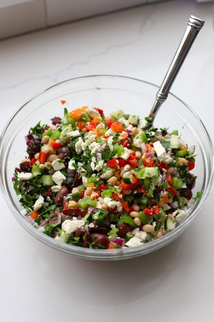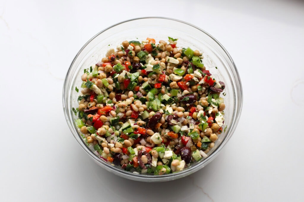 In a large bowl, add the chickpeas, navy beans, onion, bell peppers, cucumber, olives, feta, and parsley.
