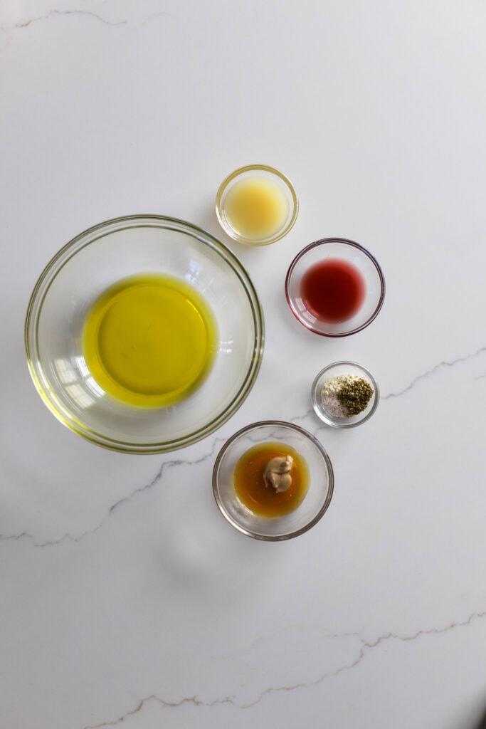 In a small bowl or jar, whisk together olive oil, lemon juice, vinegar, honey, Dijon, garlic powder, salt, and oregano until well combined.