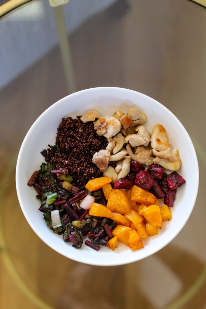 Now let’s talk lunches. Lately I’ve really been enjoying soups that I make of Sunday, freeze in cubes, and stick in the mini slow cooker in the morning to be hot and ready for me by lunch. Another winning lunch option when I’ve done some prep work, are veggie, grain, and protein bowls. The combo I most recently enjoyed for a couple days in a row was quinoa, roasted butternut squash, roasted beets, sauteed onions and beet greens, with chicken. Then I put my favorite Emily G vinegar sauce over all of it.