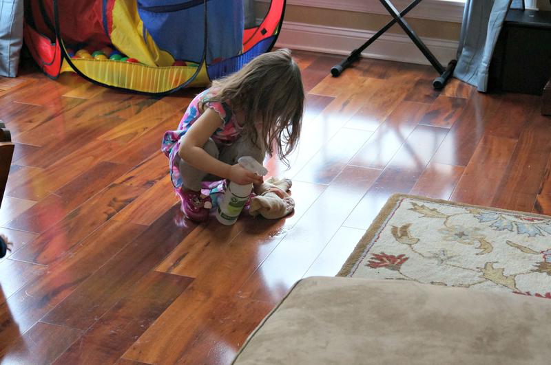 She willingly crawled around wiping up Koda’s paw prints (there are a lot of those), then continued to clean her toys and her kitchen. Such an occurrence needed to be documented.