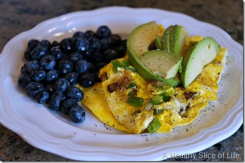 Veggie egg scramble with avocado and blueberries